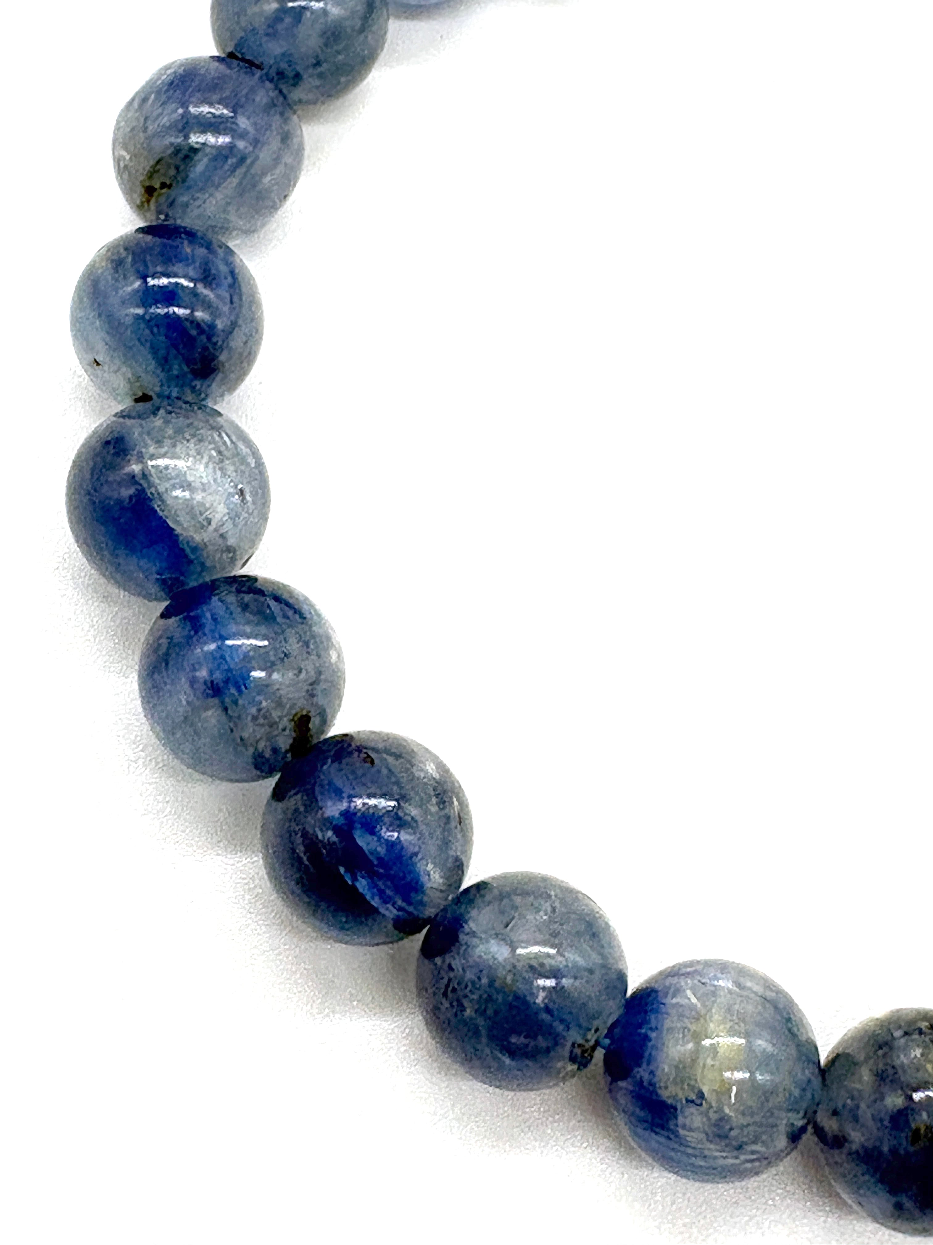こちらのカイヤナイトブレスレットは、深い青色の美しい天然カイヤナイトで作られたアイテムです。カイヤナイトは、しっかりとした決断を促し、意志を強くする手助けをしてくれるパワーストーンです。