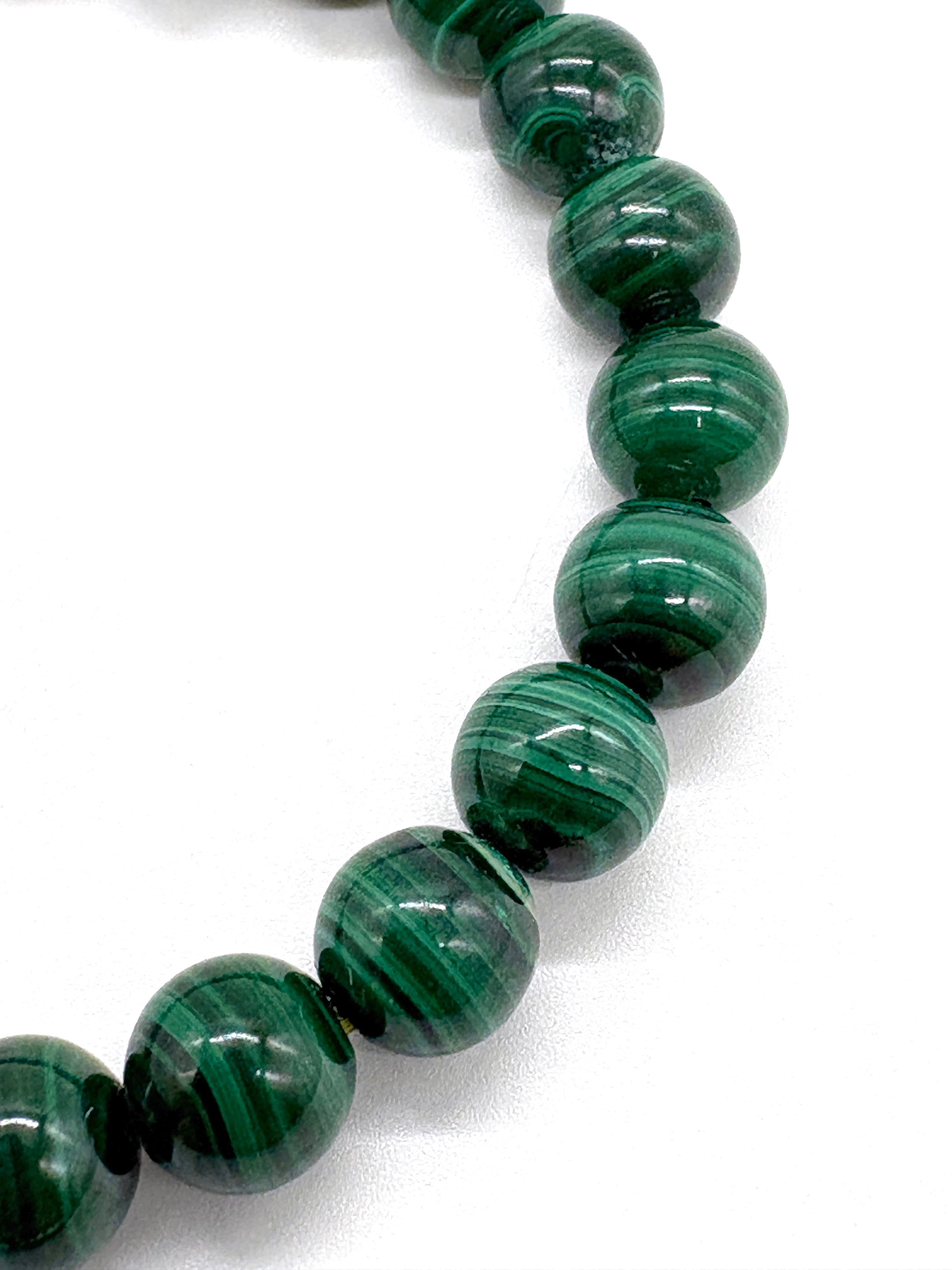 こちらのマラカイトブレスレットは、深い緑色の美しい天然マラカイトで作られたアイテムです。マラカイトは和名は孔雀石で鮮やかな緑と縞模様が特徴で、精神と肉体のストレスを和らげ、未来の危機を予見する力をもたらすとされるパワーストーンです。奉仕性が高く持つ人の苦痛を吸収し感情を解放してくれるヒーリングストーンだと言えます。